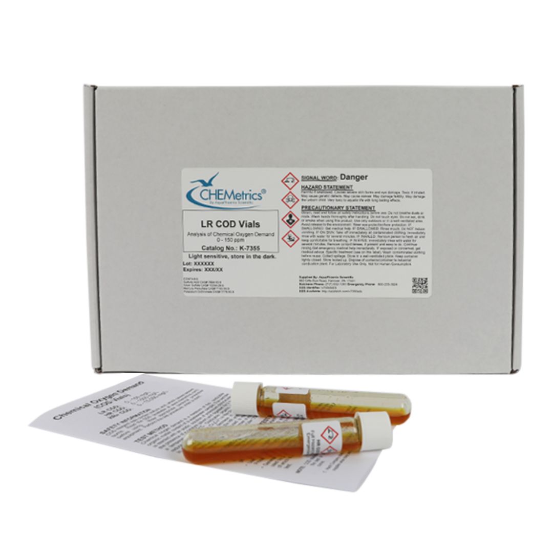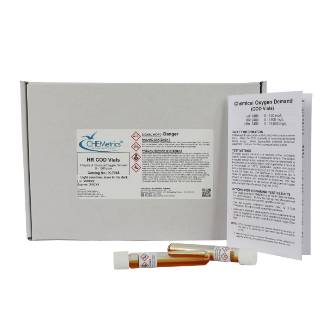 Los Kits de Viales COD (Demanda Química de Oxígeno) de CHEMetrics están diseñados para medir de manera rápida y confiable la cantidad de materia orgánica oxidizable presente en muestras de agua, expresada como mg/L de O₂ consumido.