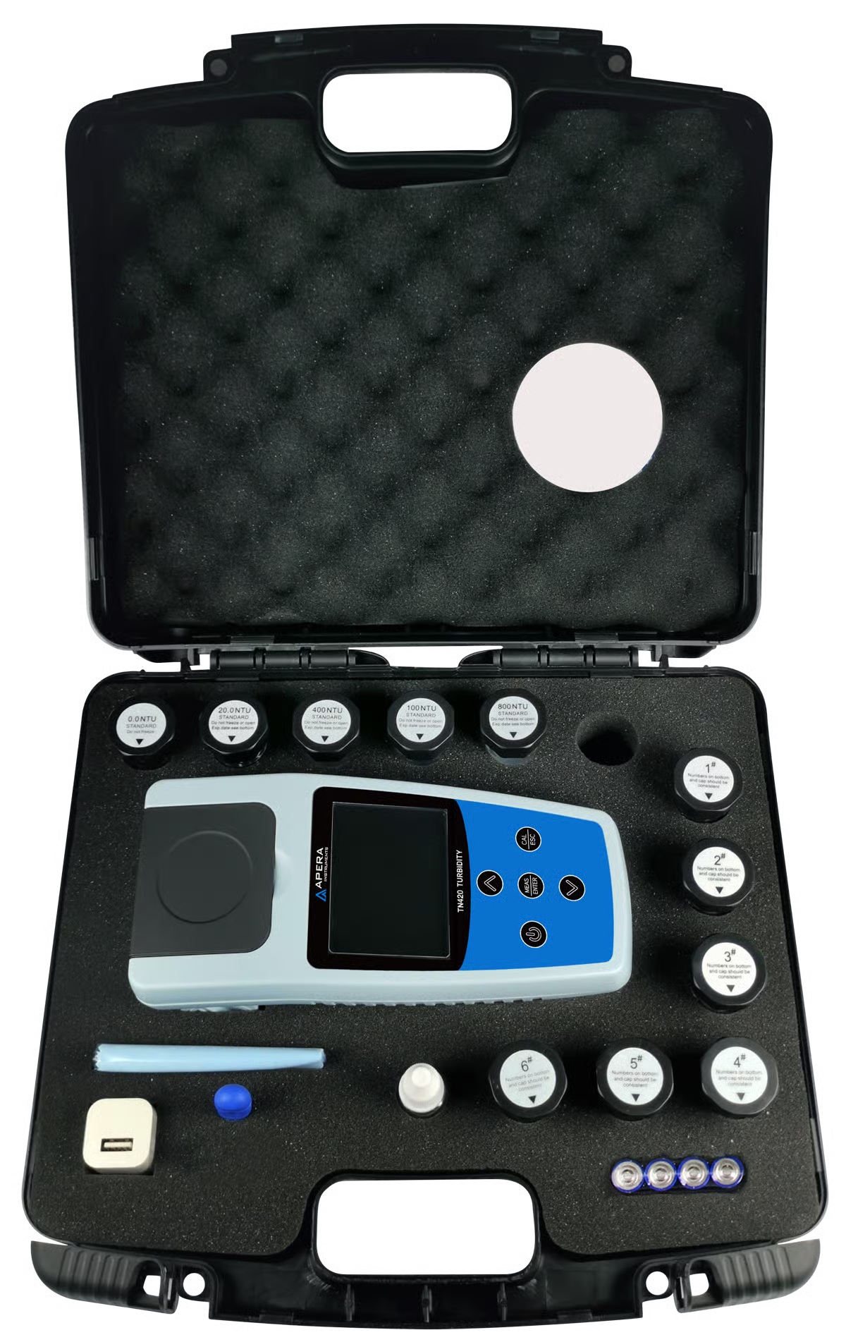El medidor portátil de turbidez TN420 de Apera está diseñado para profesionales del agua que requieren un análisis preciso y confiable en campo o laboratorio. Utiliza una lámpara de tungsteno de alta calidad y el método de dispersión a 90°, cumpliendo con la normativa EPA 180.1 para la determinación de turbidez en aguas potables, residuales, subterráneas y superficiales.